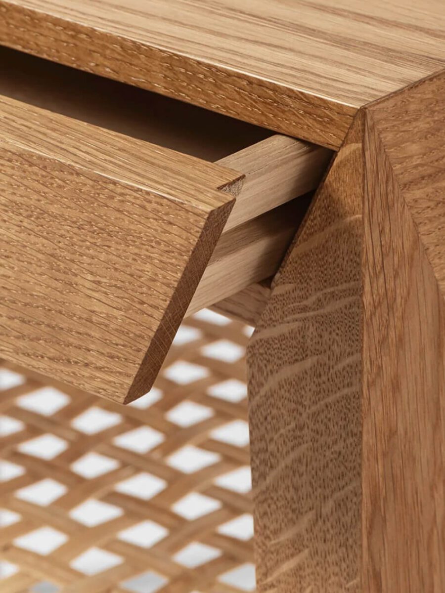 Reissued as part of the Margrethe Collection, these elegant Margrethe Bedside Tables feature Hansen’s signature 3-way mitred joints and tapering legs.